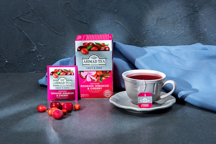 When it comes to feeling refreshed and revitalised, nothing compares to our Rosehip, Hibiscus & Cherry fruit and herb tea. Our expert Tea Masters only use 100% natural ingredients to create this beautiful crimson-red infusion. Dried cherries and natural cherry flavouring bring an authentically tart taste, while fruity hibiscus flowers and tangy rosehip give a fresh, citrusy backnote. With each ingredient bursting with intensity, this is a blend that’s sure to nurture and rejuvenate.